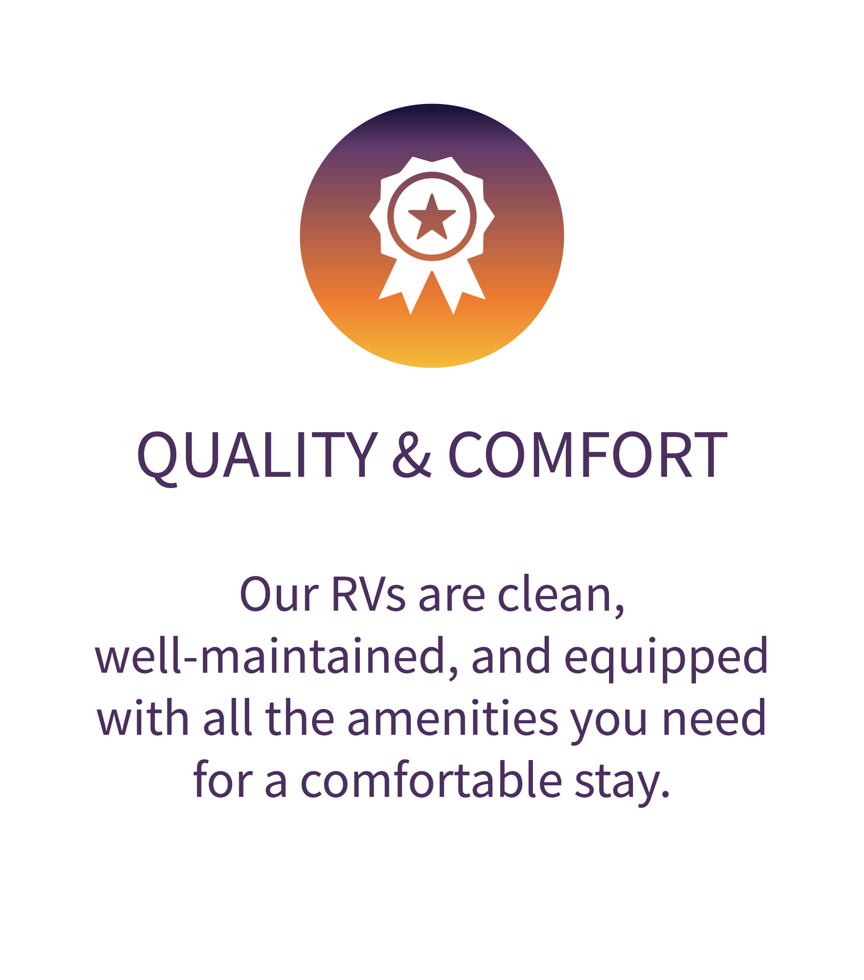 Larger Groups or Families: Our larger RVs come with ample space, full kitchens, private bathrooms, and sleeping areas for everyone in your party. Perfect for a more luxurious experience and when comfort is key!